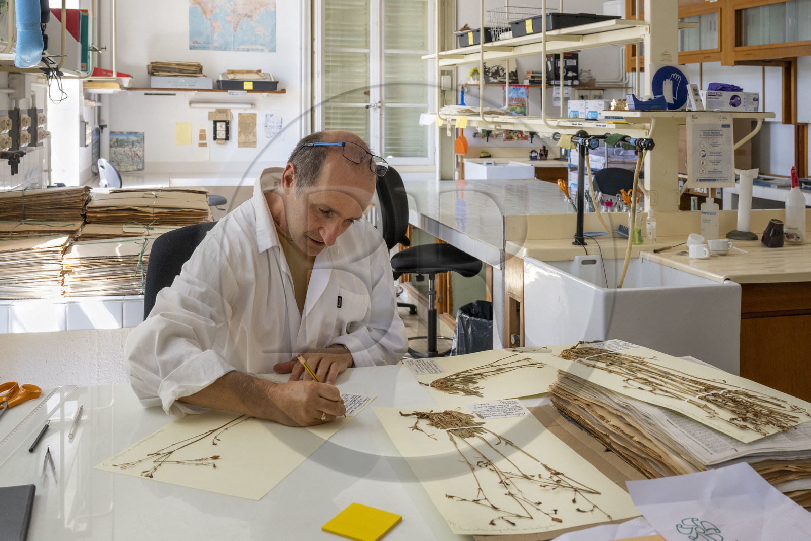 DescriptionFrance, Alpes-Maritimes (06), Antibes, Le Jardin Botanique de la Villa Thuret (rattachée à l'INRAE), labellisé Jardin Remarquable et Arbre Remarquable, un des laboratoires de recherche dans la villa, Bernard Elsair travaille sur l'herbier Thuret