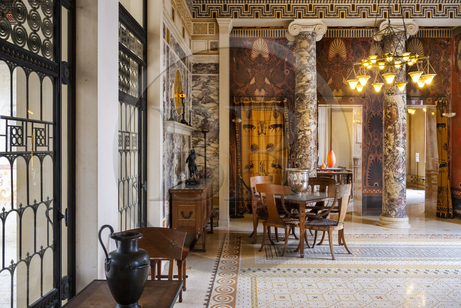 | Description | France, Alpes-Maritimes (06), France, Alpes Maritimes (06), Beaulieu sur Mer, villa Kerylos de style neo-grec construite en 1908 par architecte Emmanuel Pontremoli, l'Andron ou salon des hommes dont les murs sont revetus de marbres d'Italie |