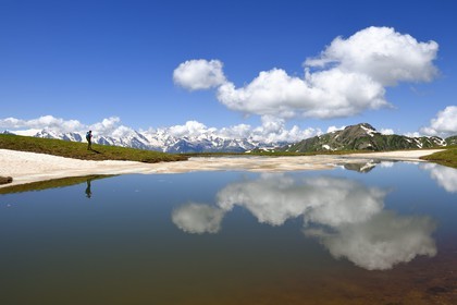 Géorgie, Haute Svanétie (Zemo Svaneti), Mestia, randonneur au lac Koruldi sur les contrefort du mont Ouchba (Ushba)