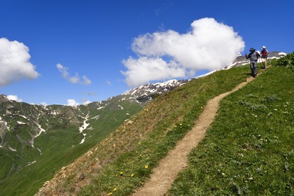 Géorgie, Haute Svanétie (Zemo Svaneti), Mestia, randonneurs vers Guli pass sur les contrefort du mont Ouchba (Ushba) que l'on aperçoit en arrière plan à gauche